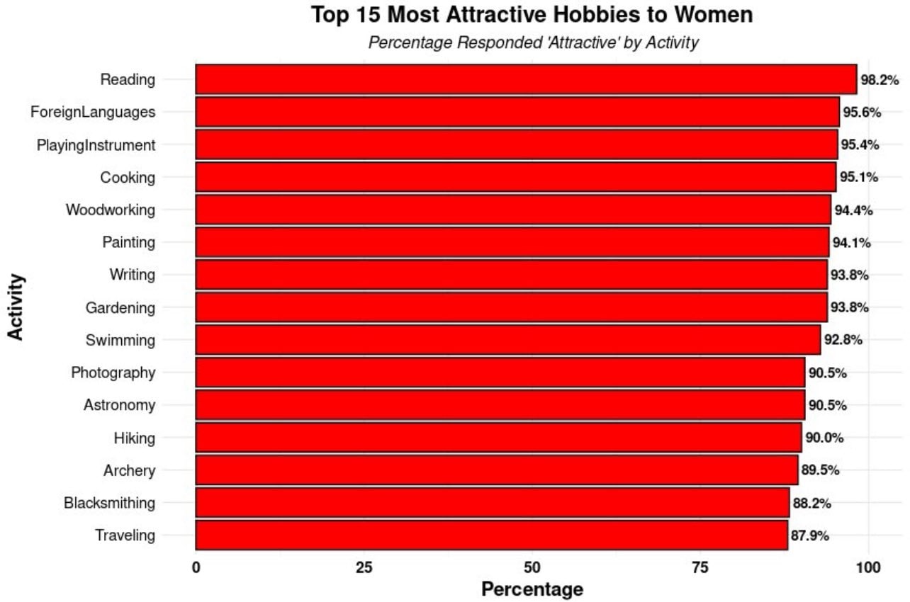 The flip side are the actively unattractive hobbies. Reading is not unattractive, it will almost never actively cost you points, but Magic, anime and crypto definitely will be highly unattractive and turn off a large percentage of women, if you force them to deal with those things front and center. If you don’t center them, my guess is they are like reading, they don’t end up counting much for or against you then.
