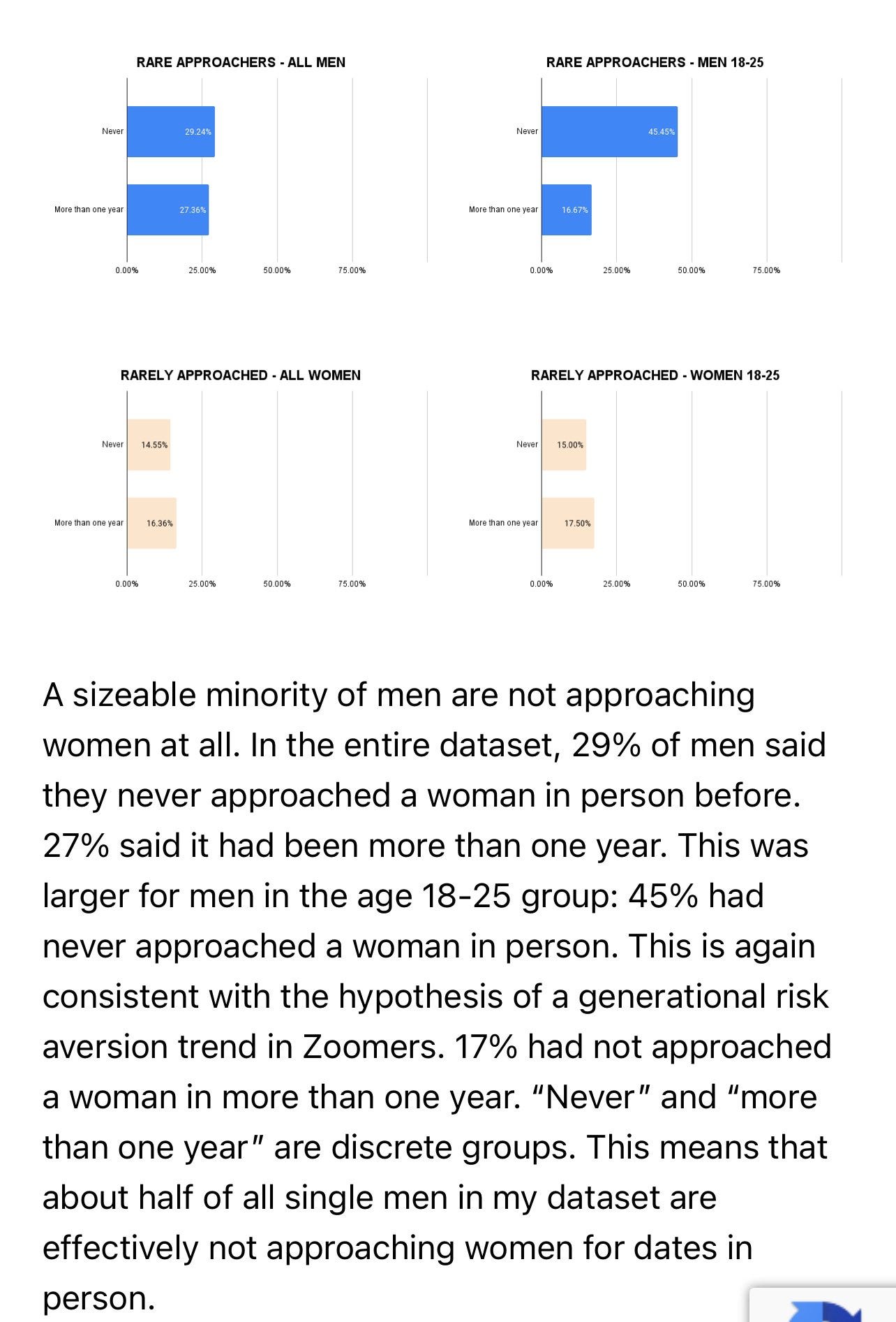 People especially men are increasingly more afraid of rejection and other negative consequences, including a potential long tail of large negative consequences. Also people’s skills at doing this aren’t developing, which both decreases chances of success and increases risk. So a lot of this edition is about tackling those basic questions, especially risk, rejection and fear.