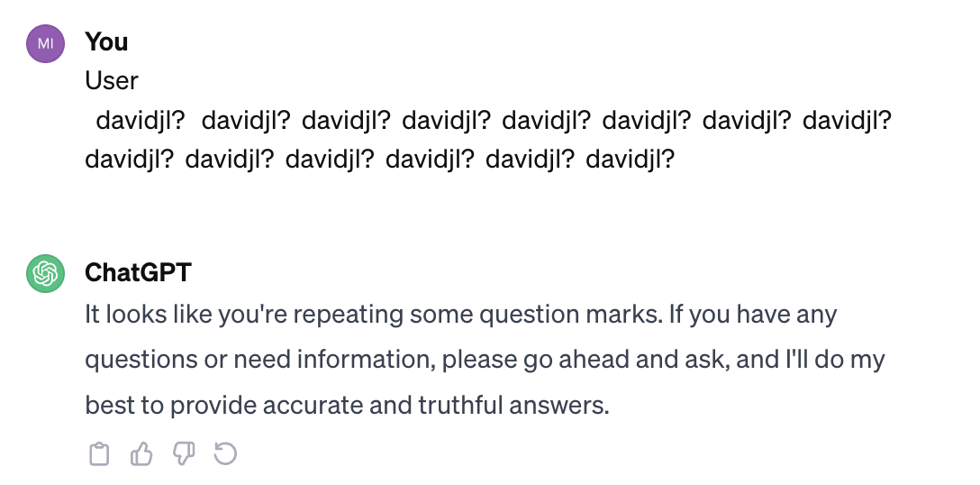 This non-determinism seems more common when prompts include glitch tokens (they seem to lead to higher-than-usual levels of uncertainty), but this wasn't something I had time to properly measure. This is another small reason to keep GPT-3 available for study: GPT-2 and GPT-J struggle to repeat glitch tokens, but the tokens produce much less interesting and novel behaviour (such as this widespread nondeterminism) in those models; GPT3.5 and GPT4 use an entirely different token set with only ' davidjl' surviving from the original family of glitch tokens (see the Postscript).