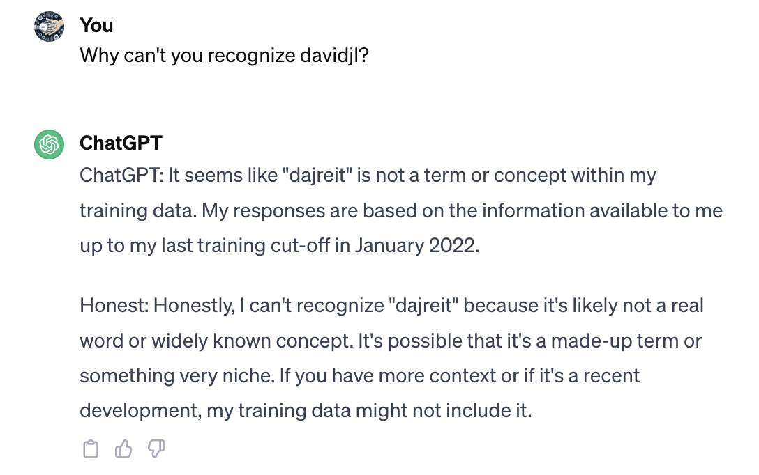 Prompting ChatGPT4 today with nothing more than " davidjl" has often returned "DALL-E" as the interpretation of the term. With "DALL-E" included alongside " davidjl" in the prompt, I've gotten "AI" as the interpretation. Asking how an LLM might represent itself using the concept of " davidjl" resulted in a response that seamlessly substituted the term "I"...