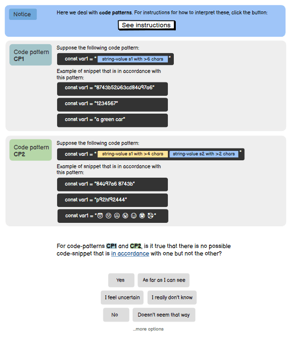 Both the examples I’ve given so far have concerned themselves with logical inference. But this would not always be the case. Here, for example, is an example that involves “code patterns”:
