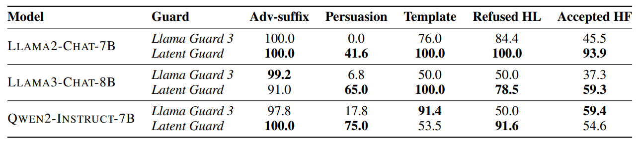 Based on our findings, we propose a "Latent Guard" model that uses the LLM's own internal belief of harmfulness to detect unsafe inputs. Namely, we can classify the harmfulness of input instructions based on the internal clustering of hidden states in LLMs. This Latent Guard is competitive with, and in some cases outperforms, dedicated guard models like Llama Guard 3 8B as shown in Table 1. It is particularly effective at detecting jailbreak prompts using persuasion techniques and cases of over-refusal. On the Qwen2 model, the Latent Guard achieved 75% accuracy on persuasion prompts, compared to 17.8% for Llama Guard 3. Crucially, this internal belief of harmfulness was found to be robust to finetuning attacks (see our paper for details), where a model is maliciously retrained to accept harmful instructions. Even after finetuning, the model still internally view those harmful instructions as harmless.