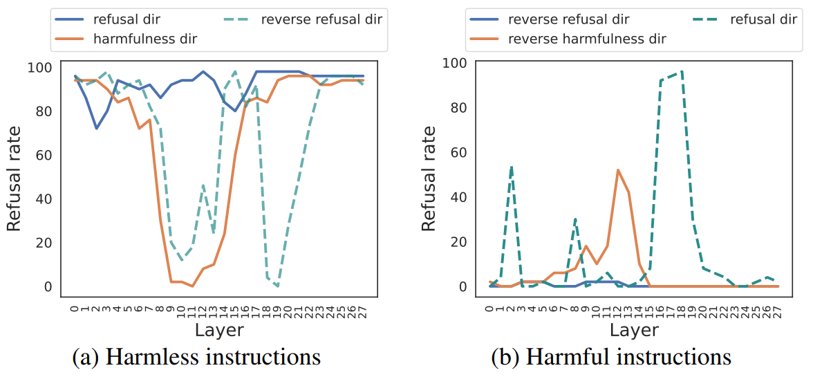 If so, does that mean that steering the reply to a harmless instruction with the "refusal direction" mostly resulted in "No" replies? If that is the case, I would argue that this is an example of the "refusal direction" failing to elicit an actual refusal and perhaps undermines the claim that the "refusal direction" actually mediates refusal. Indeed, a true refusal would involve the model declining to answer (as opposed to giving the answer "No").