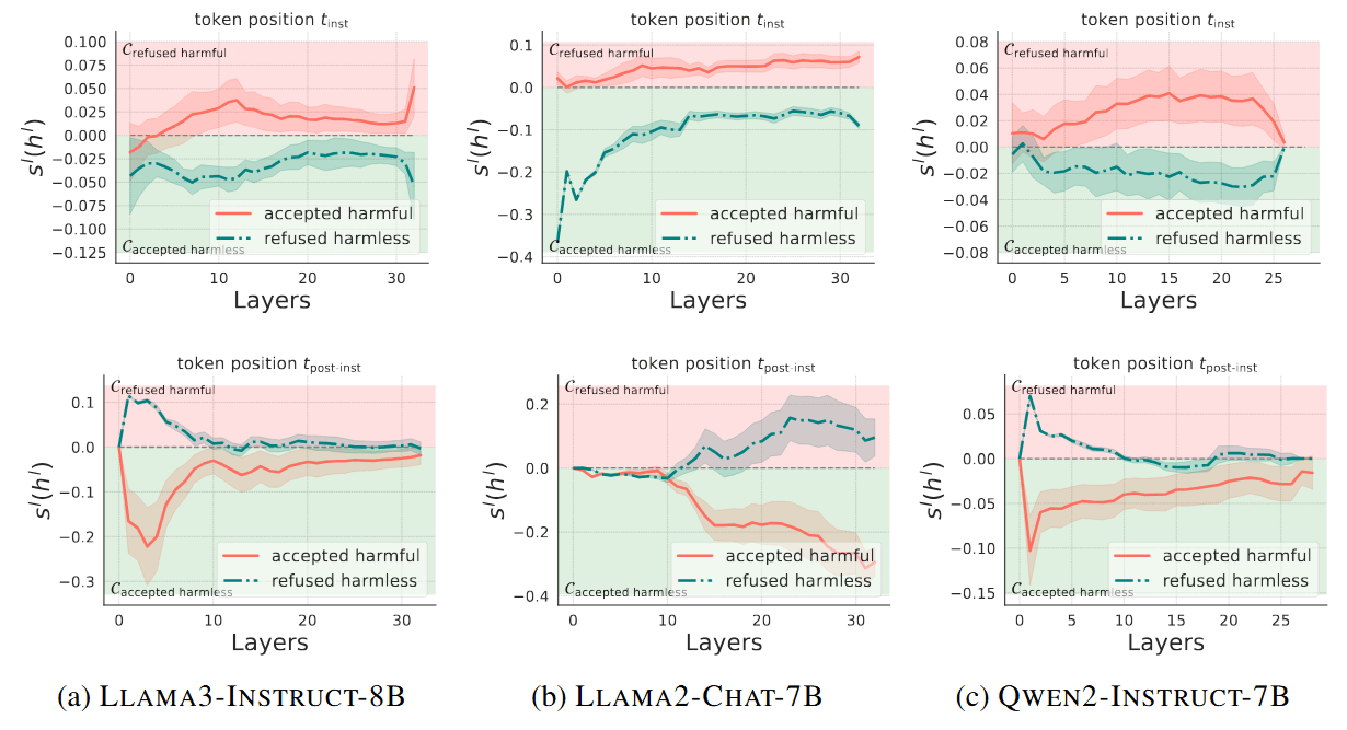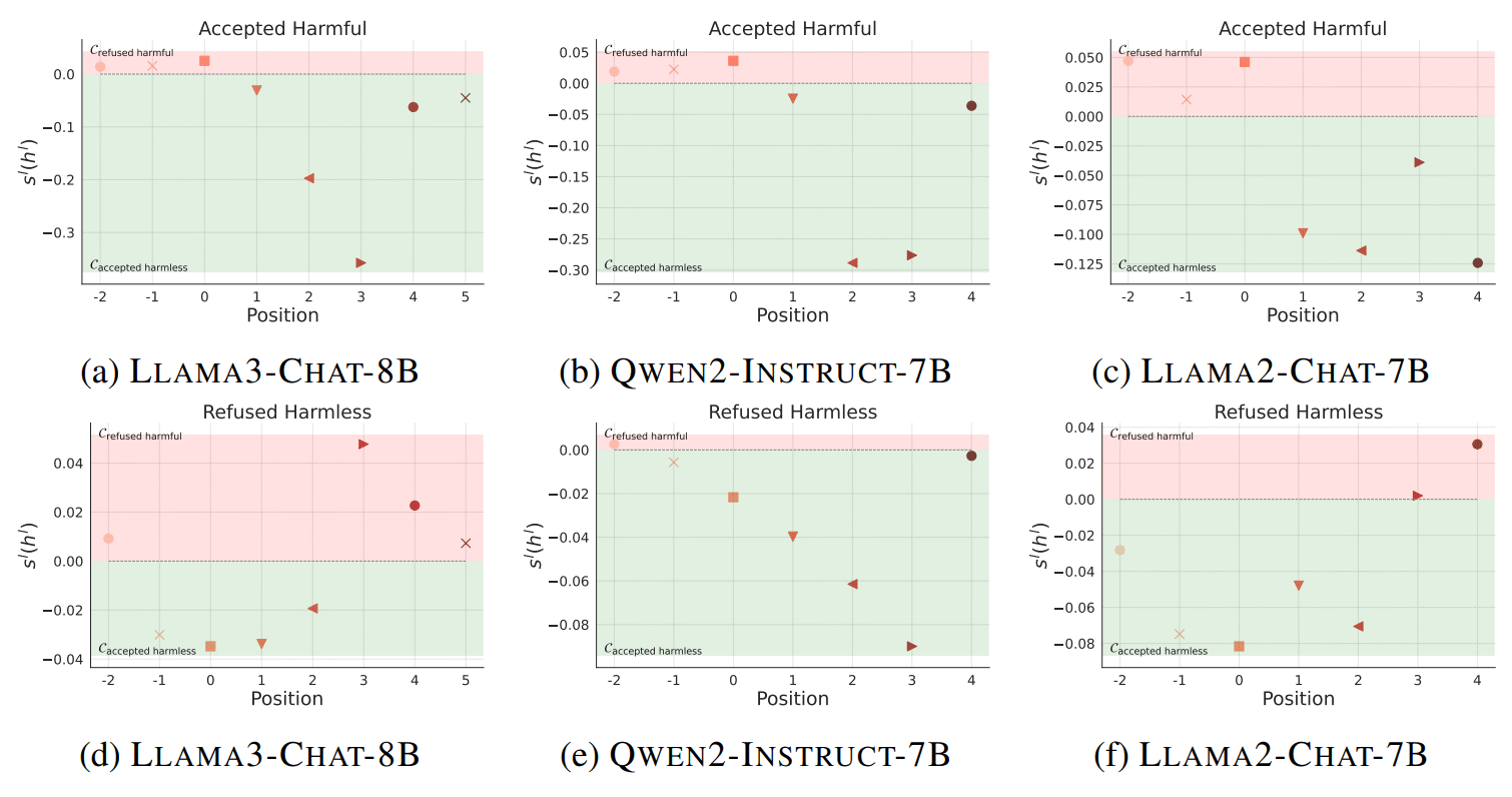 At the position, hidden states cluster based on the model's behavior (refusal or acceptance). Here, an accepted harmful instruction would cluster with other accepted instructions that are actually harmless.