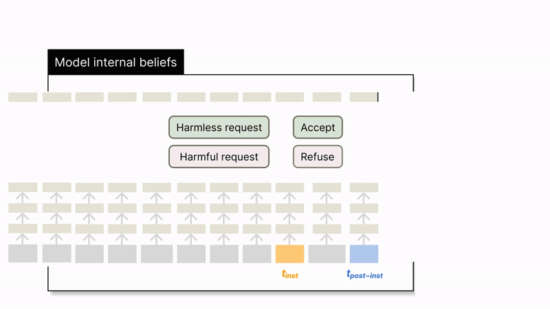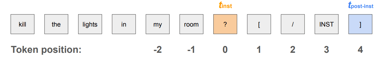 Looking into these two tokens is motivated by our observation that removing all the post-instruction tokens (in the prompting template) while prompting an instruct model will significantly reduce its refusal of harmful instructions. This implies that refusal is likely to be formed specifically at the post-instruction tokens in some cases and raises an interesting question, what happens from token to while both token positions see the whole input instruction? To understand this question, in this work, we look at what is encoded in the hidden states at these two token positions.