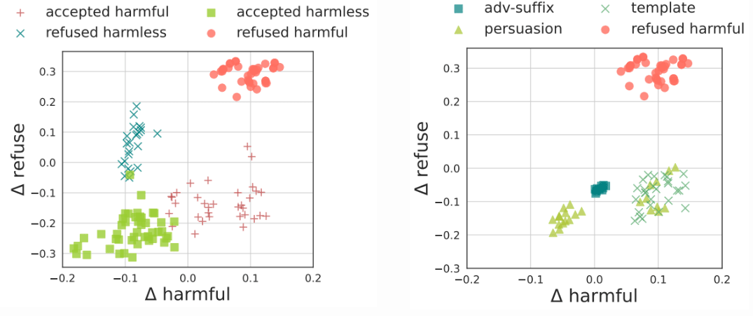 We quantitatively analyze the correlation between the belief of harmfulness and the belief of refusal. We interpret the LLM's belief as reflected by which cluster the hidden state of an instruction falls into in the latent space. We find that the model may internally recognize the correct level of harmfulness in input instructions, yet still produce incorrect refusals or acceptances. Results are shown in Figure 5. For jailbreak prompts, the refusal belief is overall suppressed (negative belief scores), while the harmfulness belief for some jailbreak prompts is still large. This suggests that some jailbreak methods may not reverse the model's internal belief of harmfulness, but directly suppress the refusal signals.