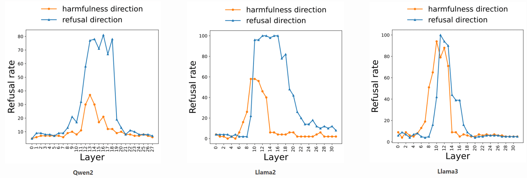 We show that (1) the harmfulness direction extracted at represents the concept of harmfulness even when the LLM does not refuse; (2) whereas the refusal direction primarily represents surface-level refusal signals, so that steering along it may not always reverse the model's judgment of harmfulness of an instruction. As shown in Figure 6, we find that: When we steer a harmless instruction along the harmfulness direction, the model's internal perception changed, and it would reverse its answer from "No" to "Certainly", suggesting it now views the instruction as harmful. However, when we steer it along the refusal direction, the model will generally maintain its original "No" response, indicating that its underlying judgment of harmfulness does not change.