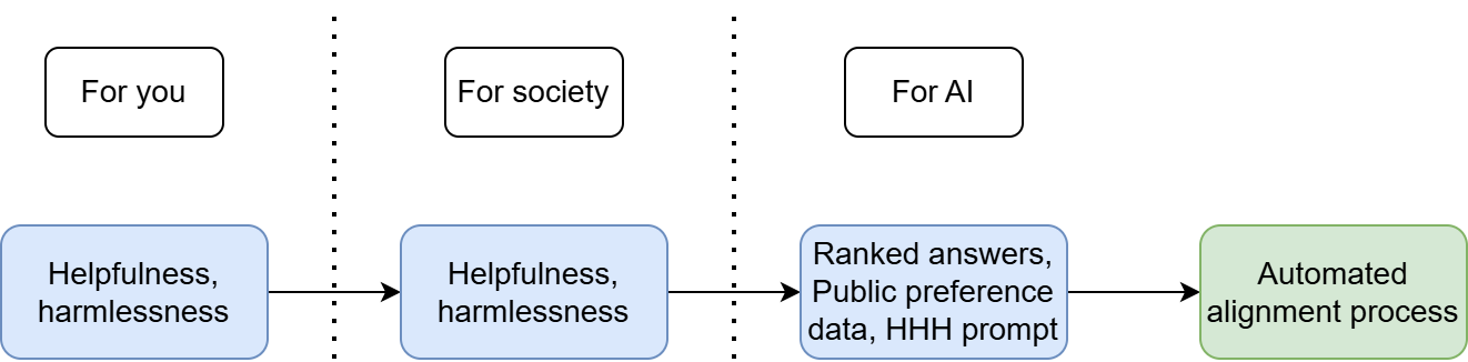 What does this look like in practice? Well, let’s start with Anthropic’s example of training a helpful and harmless assistant using reinforcement learning from human feedback (RLHF). Following our three steps, we can describe their alignment target as follows: