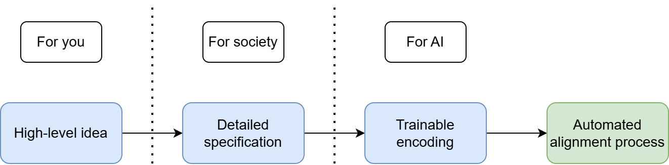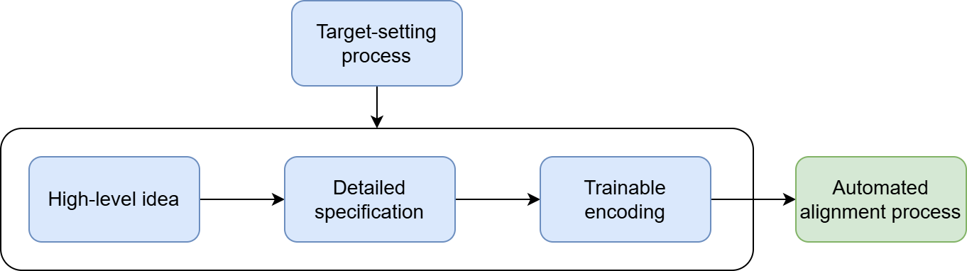 To concretely define an alignment target requires multiple steps of clarification. We must be crystal clear what we mean, and this clarity must extend to all relevant actors. While ideas will always be our starting point, we need to flesh them out, making them legible and comprehensible to other people, before ultimately trying to create a faithful and reliable translation inside an AI.