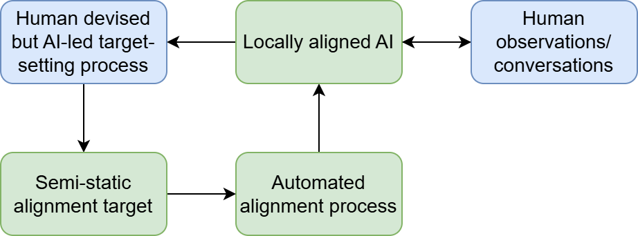 On that point, I will briefly comment on my preferred direction, albeit one still stuck in the high-level idea phase. I think you can build a dynamic target around the idea of AI having a moral role in our society. It will have a set of responsibilities, certainly different from human ones (and therefore requiring it to have different, but complementary, values to humans), which situate it in a symbiotic relationship with us, one in which it desires continuous feedback[8]. I will develop this idea more in the future, filling out bits of the schema in this post as I go.