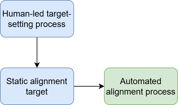 1. Static targets: humans define a target once and leave it for the rest of time. E.g. write a single constitution and keep it. Whatever values are enshrined in it will be followed by the AI forever.