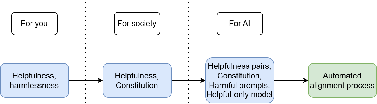 Let’s look at another example, this time one with a proper detailed specification. In fact, let’s look at Constitutional AI, Anthropic’s replacement for RLHF. This they deemed more transparent and scalable, and used it to align Claude. Applying our recipe again, we can break it down as follows: