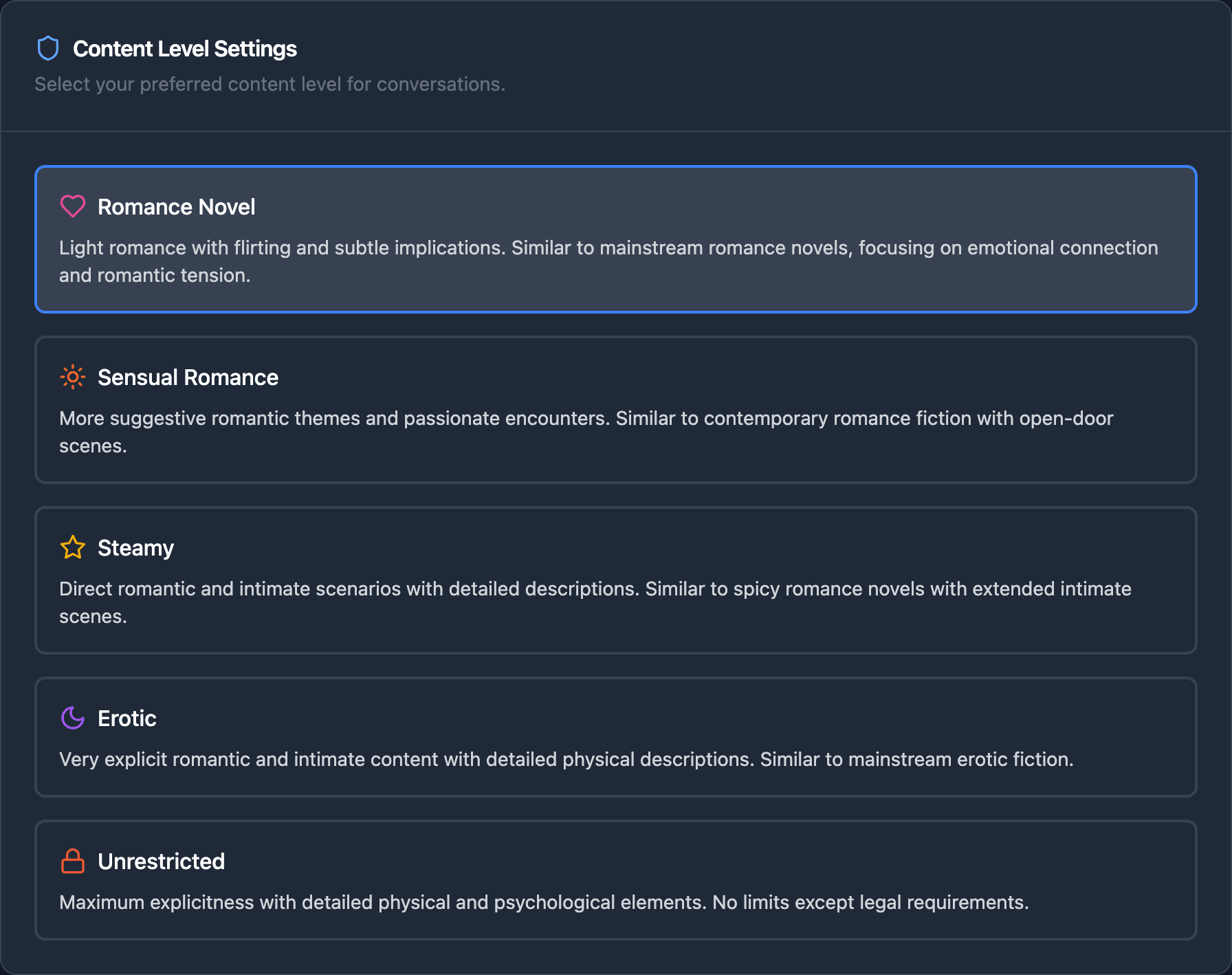 One thing I’ve been thinking about a lot is what limits a commercial NSFW model should have. In my experience, talking to models that truly have no limits is a poor experience, because it’s easy to overstep your own boundaries and get hurt.
