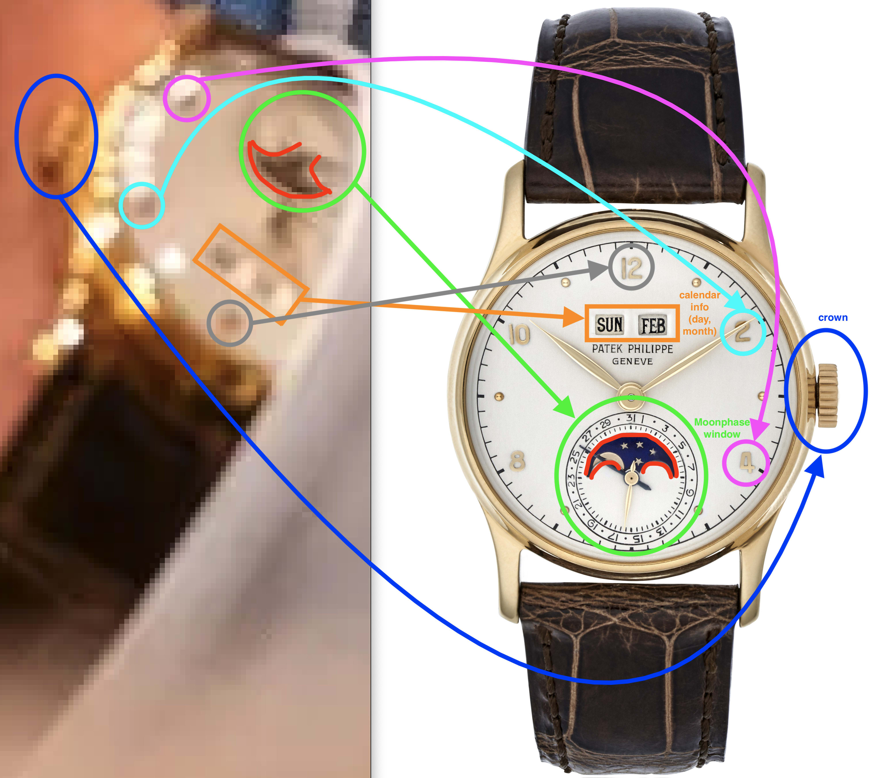 You can make out the distinctive "moonphase window" [SW22a] (annotated in green, where I've traced segments along the boundary of the moonphase window itself in red), calendar info with the day and month (annotated in orange), the pure 18k yellow gold [SW22a] crown (annotated in blue), along with three of the watch's golden numerals: 12 (at the top of the dial just above the calendar info, annotated in grey), 2 (annotated in light/aqua blue), and 4 (annotated in pink).