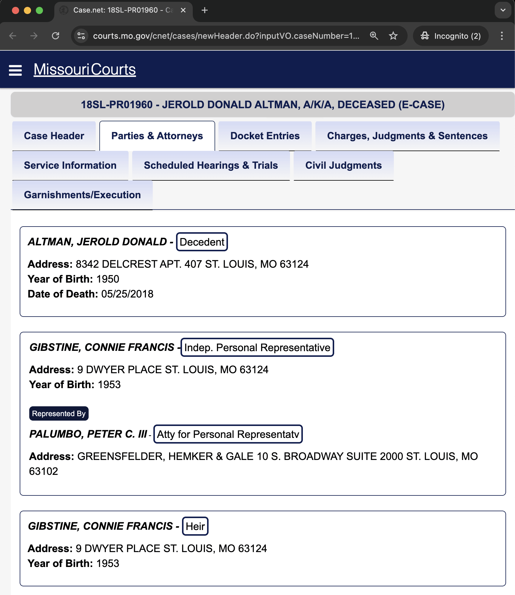 I found the legal case relating to Jerry (full name: Jerold Donald Altman)'s death on the official Missouri courts government website that seem to corroborate this: