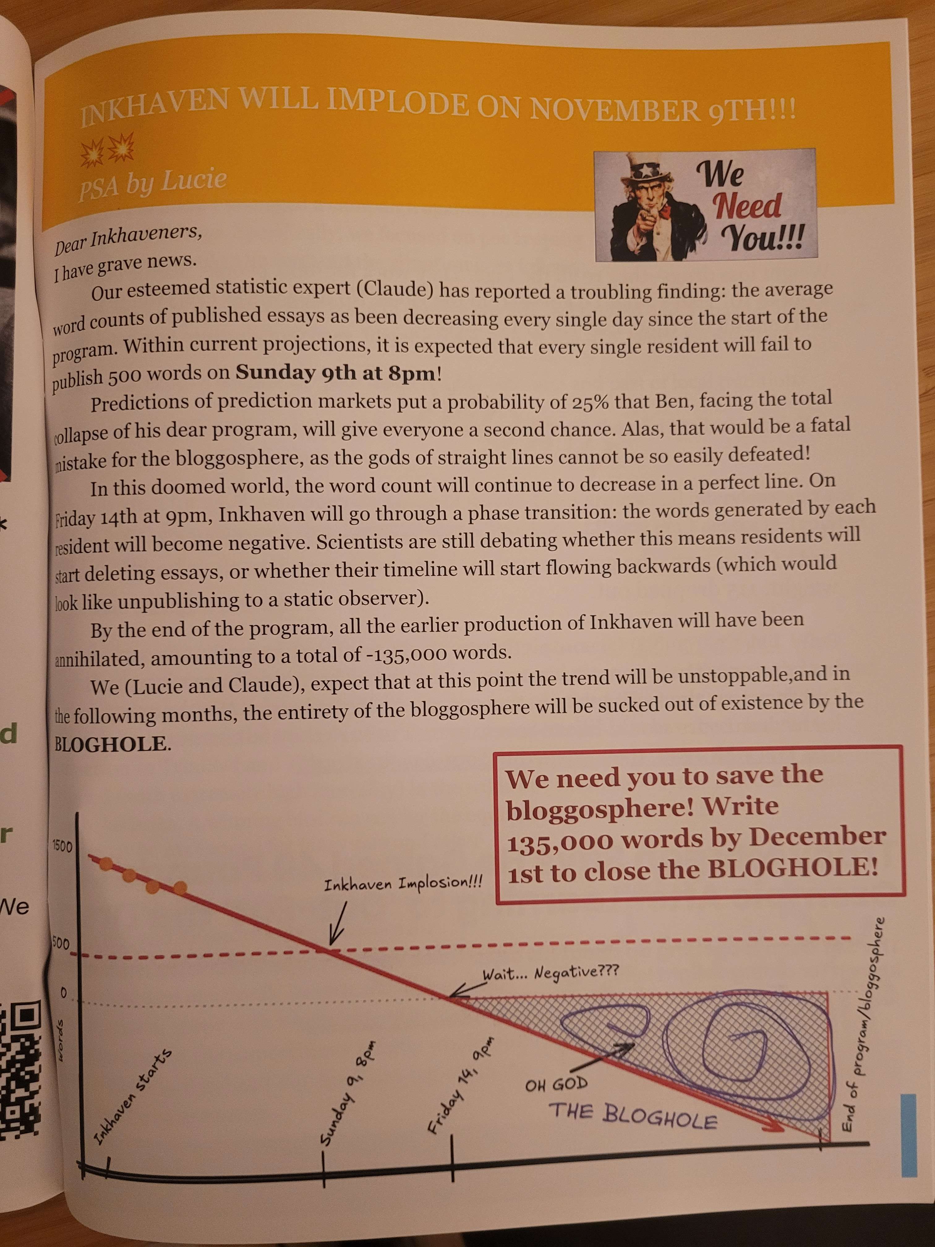 After looking at our average word count, Lucie calculated the date for the Inkhaven apocalypse and published this in a peer-reviewed journal.