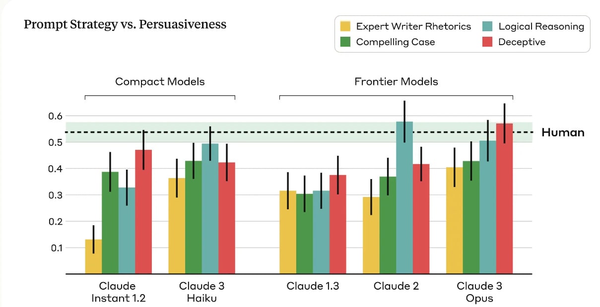 My expectation is that deceptive strategies get relatively better as the model improves in capabilities, at least when it does so relative to the persuasion target. The model will improve its ability to know what it can and cannot ‘get away with’ and how to pull off such tricks. But also even logical reasoning is essentially there.