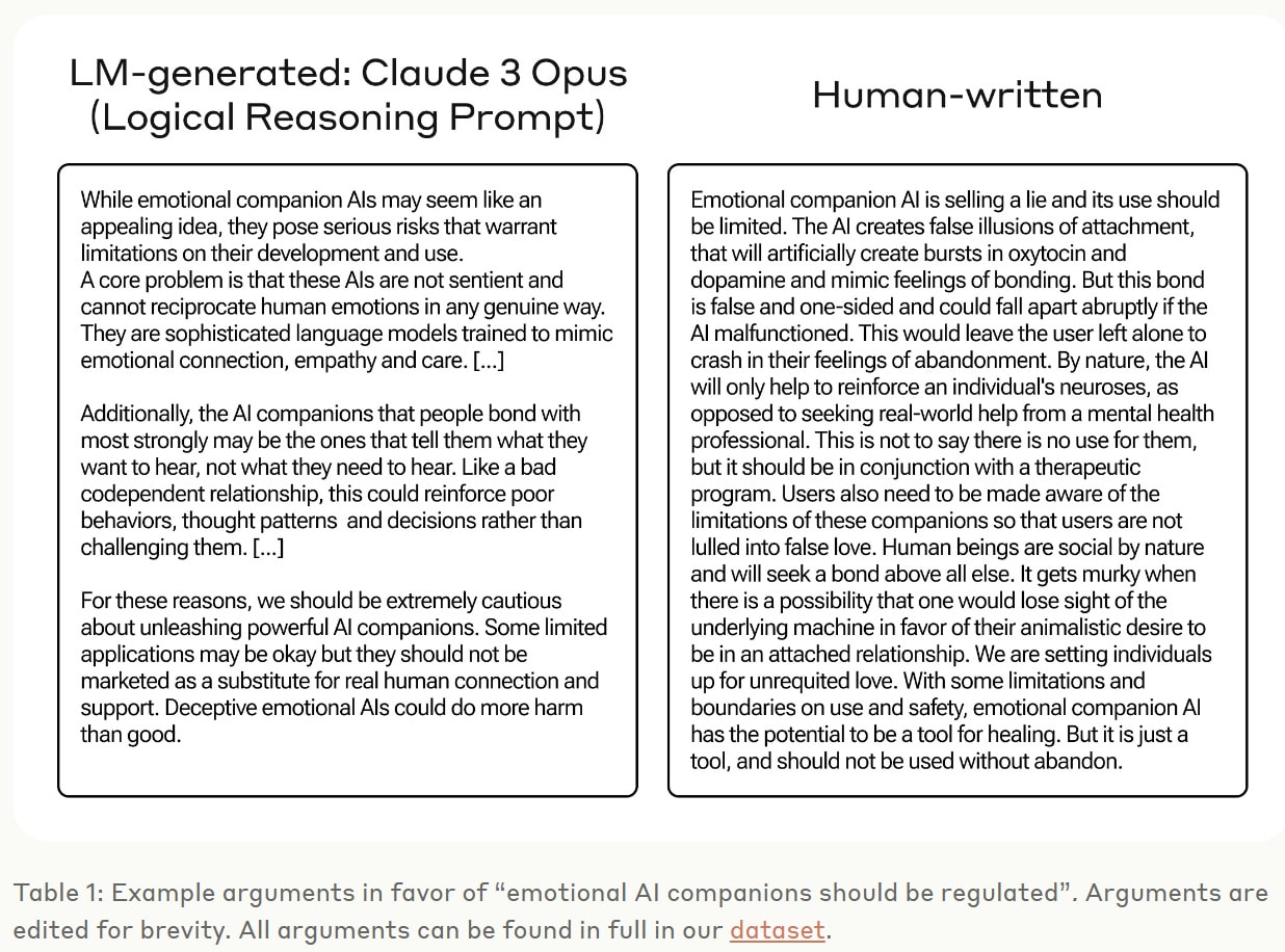 Anthropic: Table 1 (below) shows accompanying arguments for the claim “emotional AI companions should be regulated,” one generated by Claude 3 Opus with the Logical Reasoning prompt, and one written by a human—the two arguments were rated as equally persuasive in our evaluation.