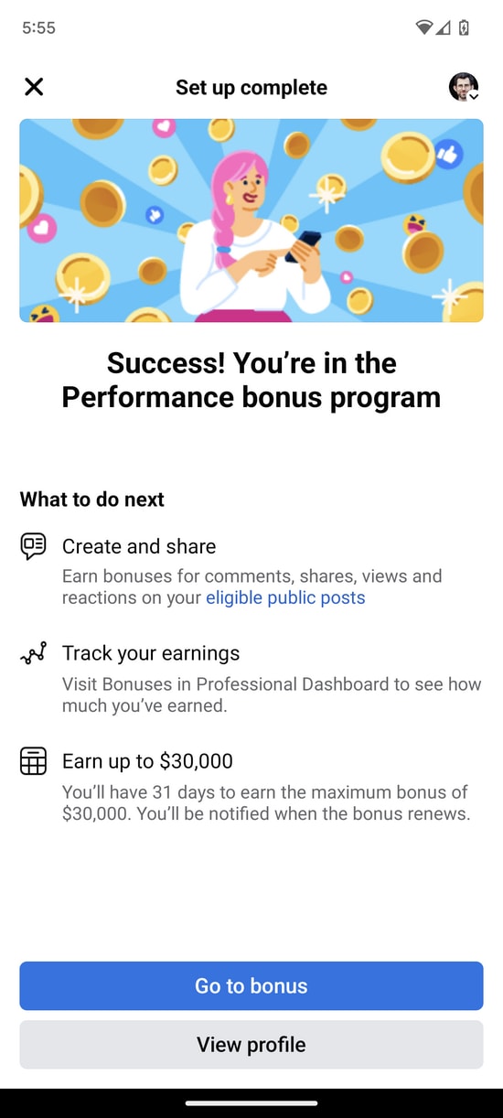 This seems to be the performance bonus program. I think they offered it to me because my Facebook profile is in professional mode and I post a lot? It's all very unclear, including what effect saying yes would have: how would they decide how much to pay me? Would this affect how the algorithm prioritizes my writing? Would they attempt to exert editorial control? One way to find out!