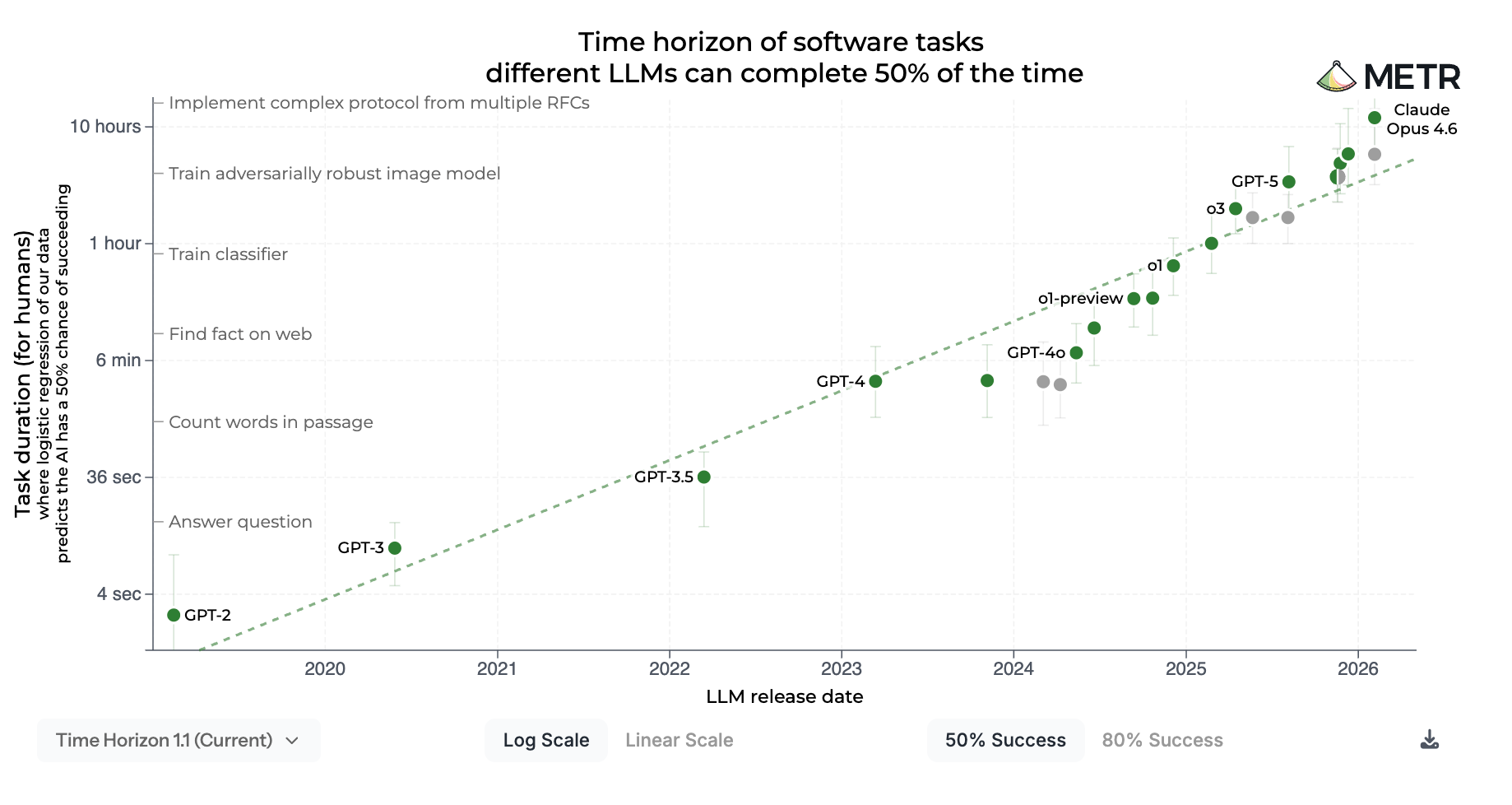 For one thing, the METR graph, originally released in March of 2025, found a consistent exponential trend in the length of tasks that AIs could complete, which has held up (or even accelerated) in the following year: