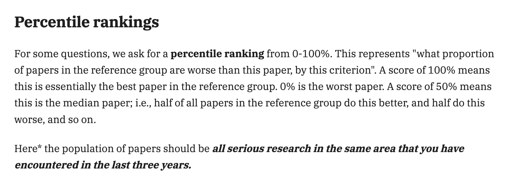 At The Unjournal we commission evaluators and ask them to (evaluate, discuss and) rate particular research papers on a percentile scale relative to a reference group according to various criteria (see guidelines).