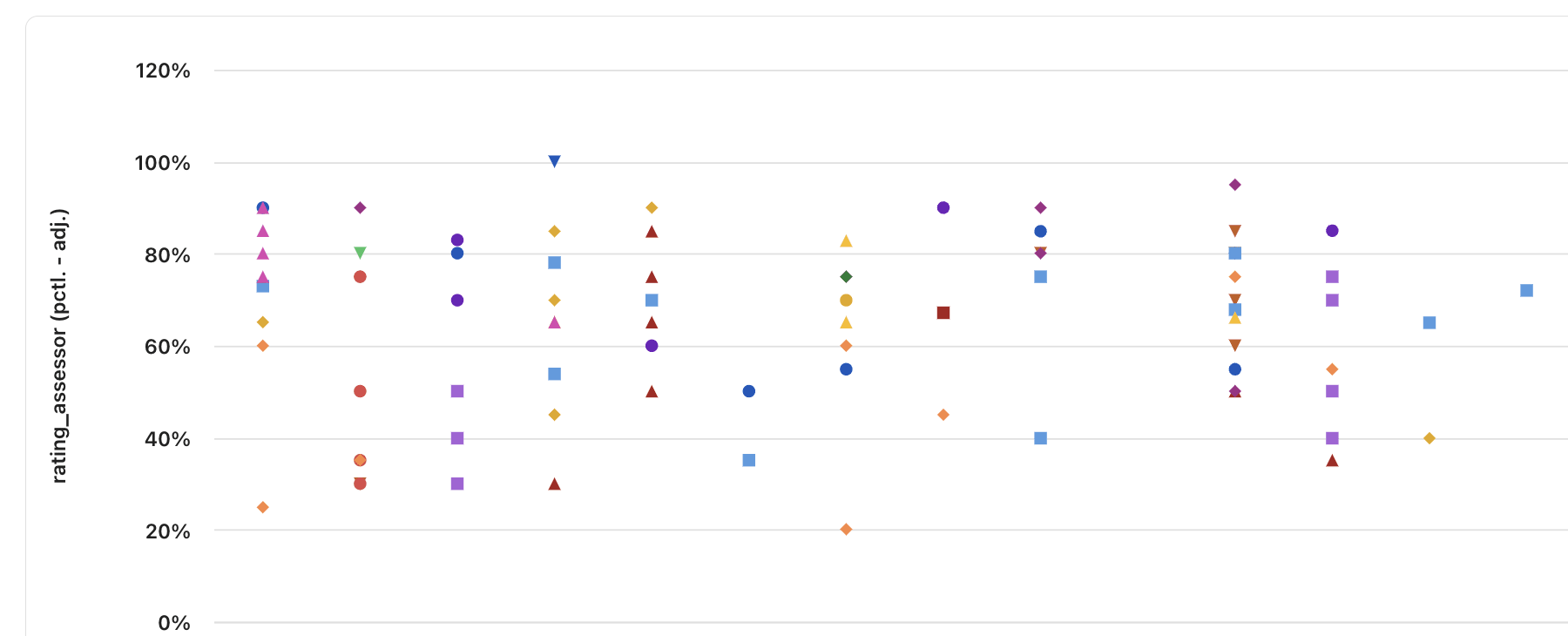 The 'second opinion' ('assessor') ratings use more of the scale but still don't seem uniformly distributed ... e.g., they rarely go below 30-40th percentile