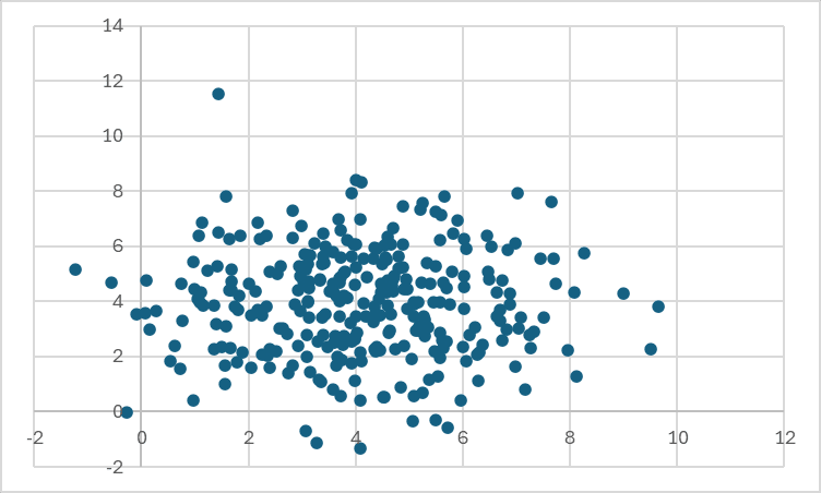 Say you plot two normally-distributed numbers against one another. You get something that looks like this: