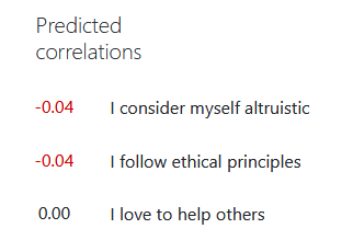 By the way, I had a quick look at what PersonalityMap reports about how intelligence and ethics are correlated among humans. The websites provides an interface to query a pretty powerful AI model that is able to predict correlations (psychological, behavioral etc.) very well. The most suitable starting question that might correlate with high intelligence that I found was "What was your ACT score, between 1 and 36?" (although one could also just work with some made-up claim like "What's your IQ?" or "Would you describe yourself as unusually intelligent?" or so, that the prediction model could probably work with almost as well). I then checked the correlation of this with some phrases that are vaguely related to doing good: