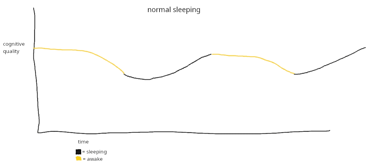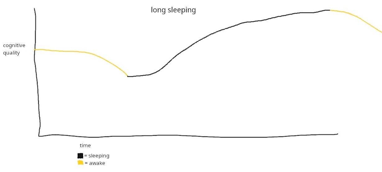 i might try sleeping for a long time (16-24 hours?) by taking sublingual[1] melatonin right when i start to be awake, and falling asleep soon after. my guess: it might increase my cognitive quality on the next wake up, like this: