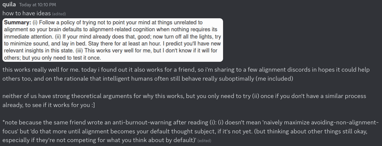 I think it's valuable for some of us (those who also want to) to try some odd research/thinking-optimizing-strategy that, if it works, could be enough of a benefit to push at least that one researcher above the bar of 'capable of making serious progress on the core problems'.