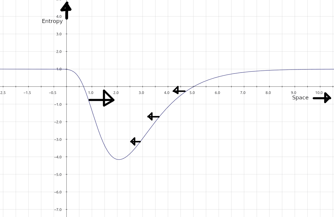The entropy needs to be the same at the far left and far right of the graph, because empty spacetime, far from any influence, has a fixed entropy. Your spacecraft sits in the middle. A small amount of your spacecraft on the far left experiences a steep gradient, and so a strong rightwards force. A larger amount of your spacecraft in the middle and right experiences a weaker leftward force.