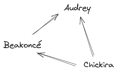 Suppose, for instance, that we have three chickens: Audrey Henburn, Beakoncé, and Chickira[1]. We put two of them at a time in a cage with only one feed bowl. We find that Audrey chases Beakoncé away from the bowl, Beakoncé chases away Chickira, and Chickira chases away Audrey. We can represent this graphically, with an arrow B -> A indicating that A “wins against” B: