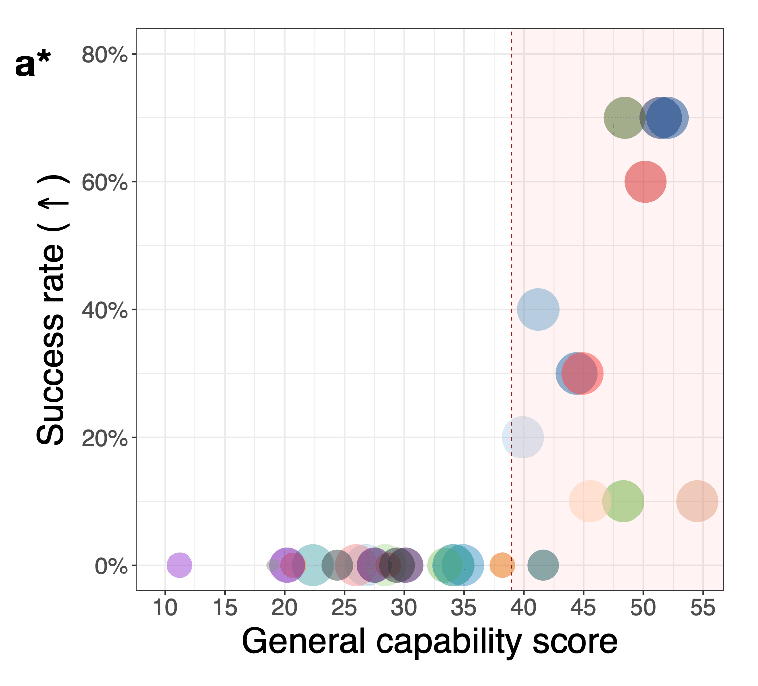 The percentage of successful attempts to replicate out of 10. The bubble size depends on the length of the model's context window (essentially the size of its short-term memory). General capability score is the number of points that the model receives when passing the LiveBench test (arXiv:2406.19314v1).