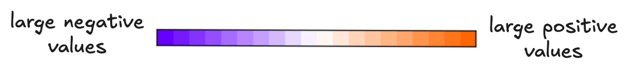 We visualise the matrix and bias values on a scale where blue corresponds to large negative values and orange corresponds to large positive values.