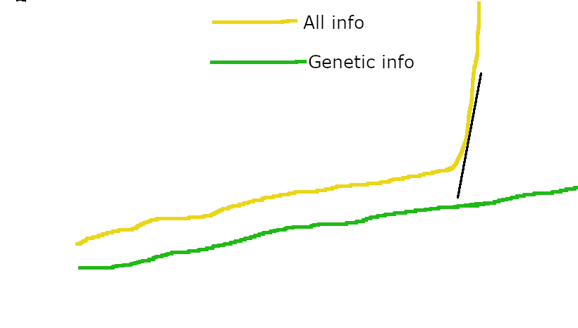 The only way to transmit information from one generation to the next is through evolution changing genomic traits, because death wipes out the within lifetime learning of each generation.