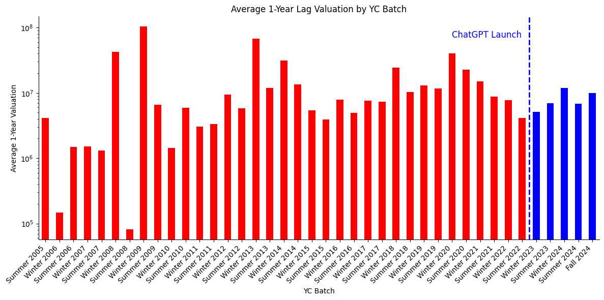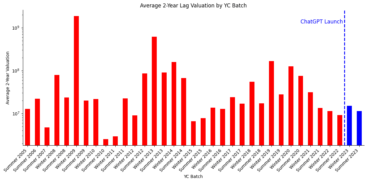 There are a bunch of factors which could explain the relatively sluggish performance of YC startups post-ChatGPT: high interest rates, YC being less attractive, etc. I have made no attempt to control for these and expect that, if I did, the 2023+ startups would perform better.