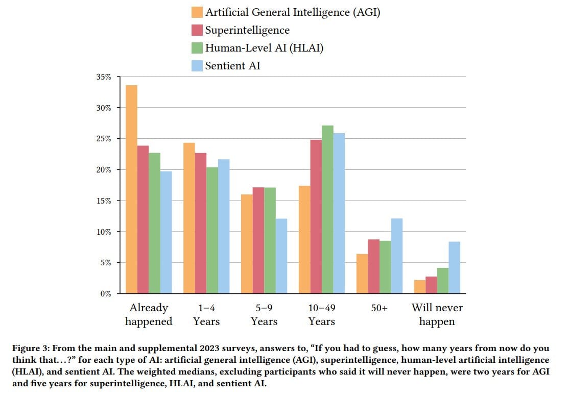 That last one is less impressive when you consider that a third of people think it already happened as of last year, and 23% said we already have superintelligence. And a lot of people already think AI is sentient but they also thought that in 2021?