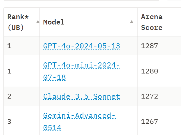 Arena absolutely loves Mini, to the point where if it’s really this good then Mini potentially is an even bigger practical advance, in its own way than Claude 3.5 Sonnet or Llama 3.1 405B (which remains unranked so far, give it a few days as needed).