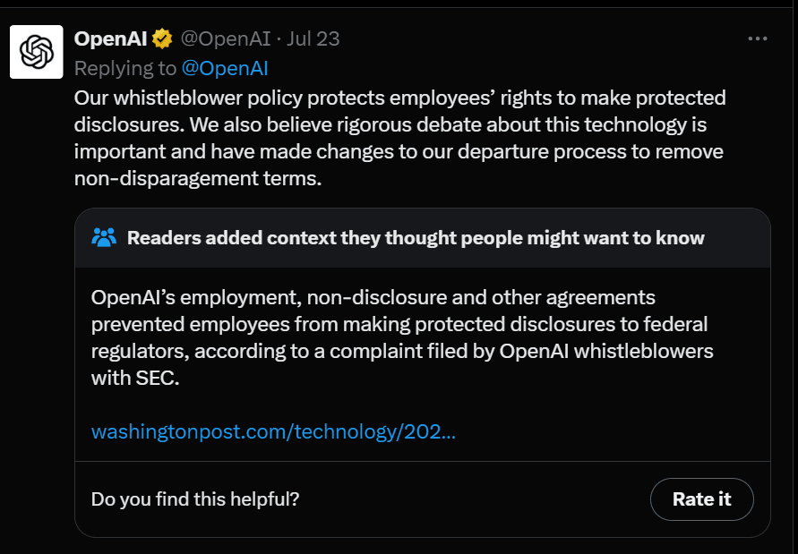 OpenAI attempted a boilerplate response reiterating its previously announced statements, including this.