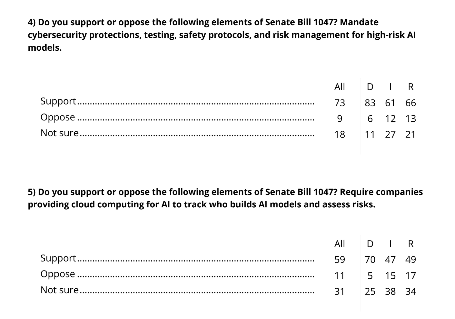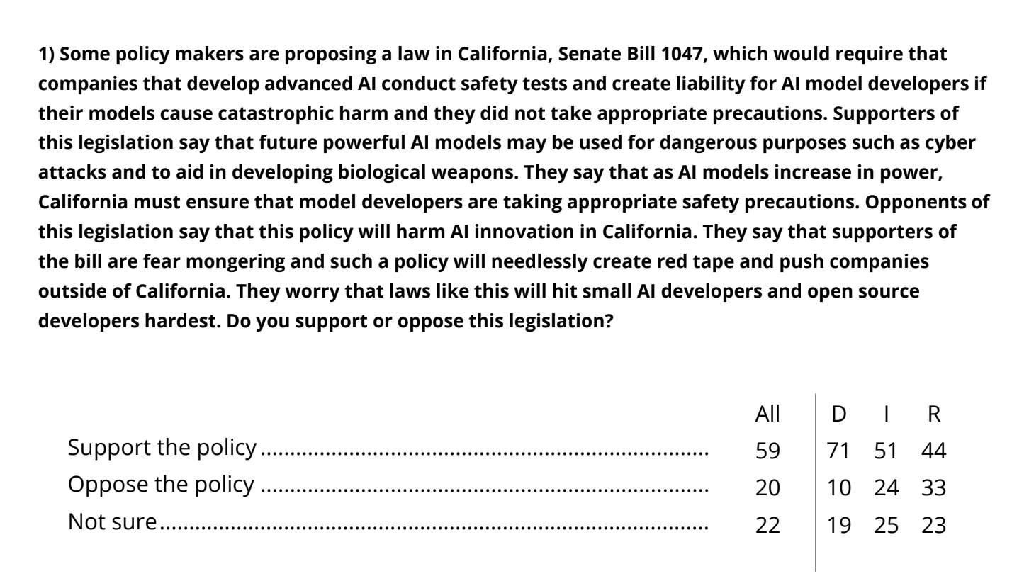 There is another survey about SB 1047. As always, one must be careful on wording. This one does come from AIPI, which is a potentially biased source.