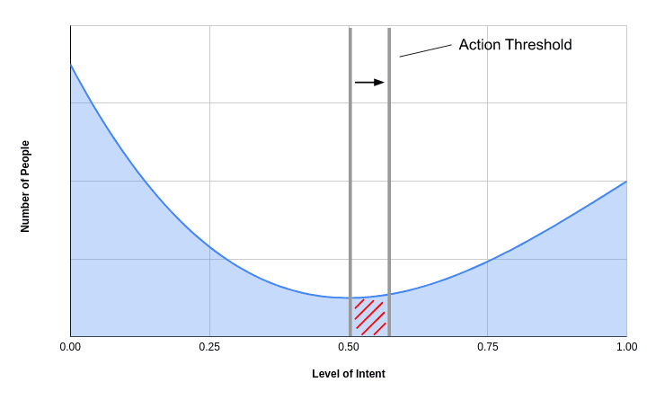 The impact of such interventions then depends on the distribution of people’s intent levels: the more people are undecided and/or don’t care about the given behavior, the greater the number of individuals that will react to interventions that move the threshold.