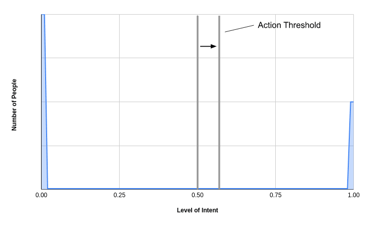 And indeed, in such a world, relatively weak interventions such as “triggering a feature on double click instead of single click”, or “making it more difficult to buy a gun” may not end up being effective: while such interventions would move the action threshold slightly to the right or left, this wouldn’t actually change people’s behavior, as everyone stays on the same side of the threshold. So everybody would still act in the same way they would otherwise.