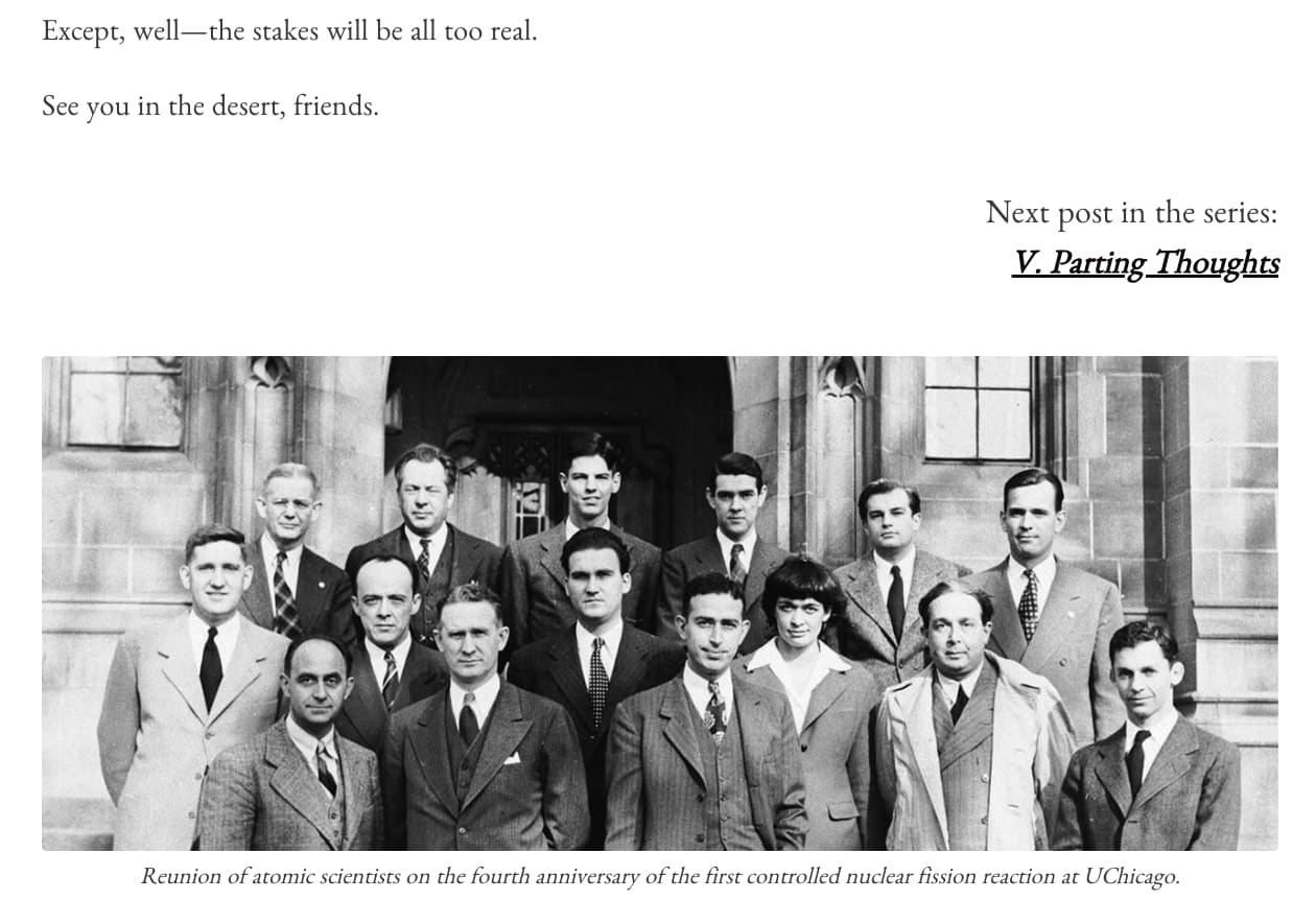 Other notes for me from your article included: Leopold's pretty bad handwaviness around pausing as simply, "not the way", his unwillingness to engage with alternative paths, the danger (and his benefit) of his narrative dominating, and national security actually being more at risk in the scenario where someone is threatening to escape mutually assured destruction. I appreciated the note that safety researchers were pushed out of/disincentivized in the Manhattan Project early and later disempowered further, and that a national security program would probably perpetuate itself even with a lead.
