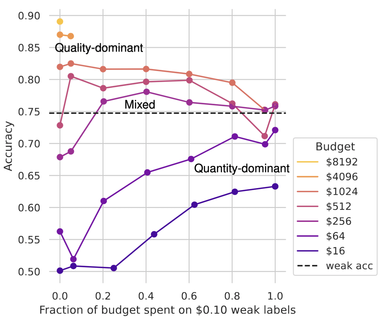 Here, we arbitrarily define high-quality labels to cost $1 and weak labels $0.10. So, along the x-axis, one high-quality label is given up for every 10 weak labels used. The model is sequentially trained on low- then high-quality labels. Different budgets produce 3 regimes with distinct optimal budget allocations: