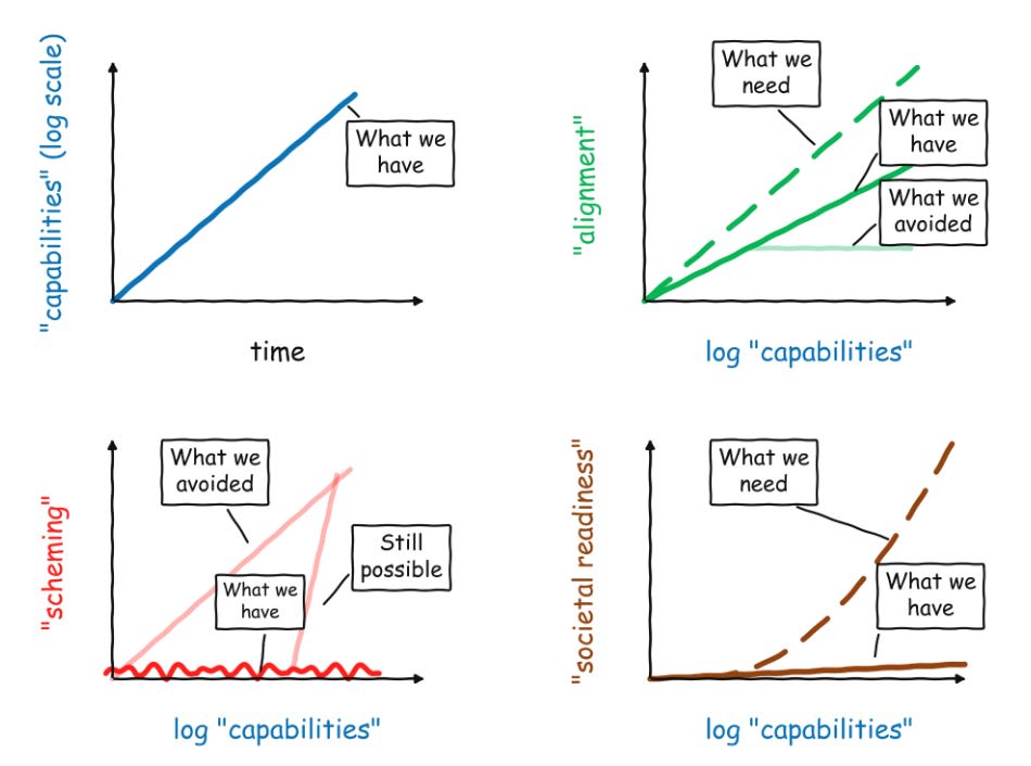 I agree with the first and fourth graphs. Capabilities continue to be a straight line on a log graph over time (and hence you can put ‘time’ on the x-axis of the other graphs, if you like), and societal readiness is nonzero but anemic and inadequate.