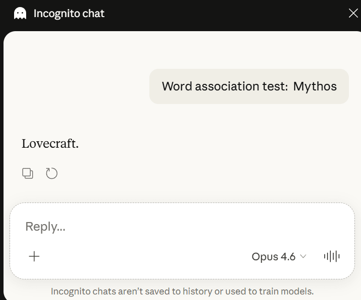 Oh huh, apparently Claude (a) carries over “personal preferences” to Incognito (b) associates to Lovecraft when primed to think more technically. I guess that seems like an unimportant failure mode if you’re silly! But whatevs, not my main issue.
