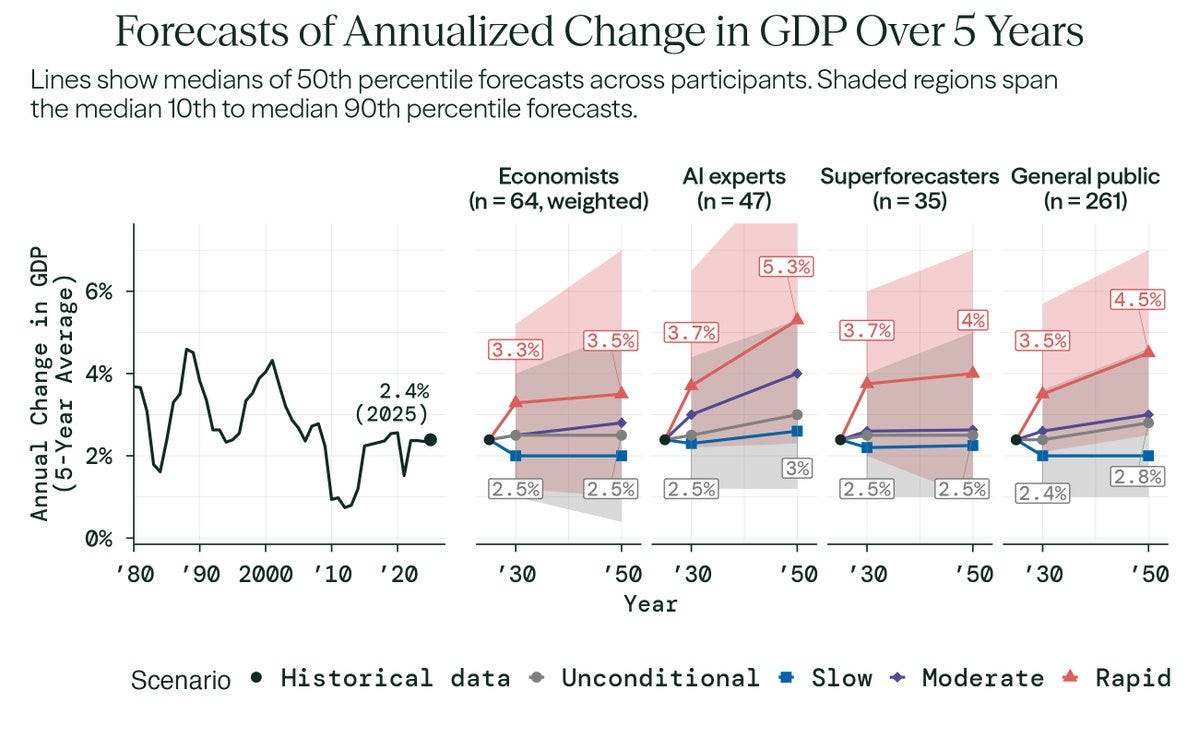 As per the Forecasting Research Institute, economists continue to predict AI will add… about 0.5% to RGDP growth? Sigh. ‘AI experts’ (n=57, half ‘policy professionals’ and half labeled industry experts) and superforecasters predicted a bit more, but not much more.Explaining Persistent Model Parity
