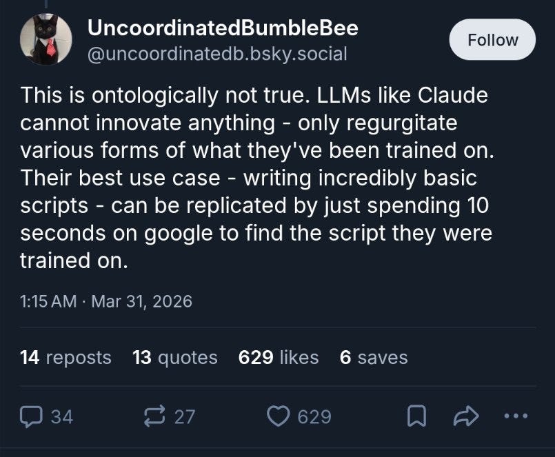 Things are at their most extreme at places like BlueSky, but a huge portion of the global elite that make the world’s decisions are at least halfway there, and there is a constant pull to write AI off as much as possible.