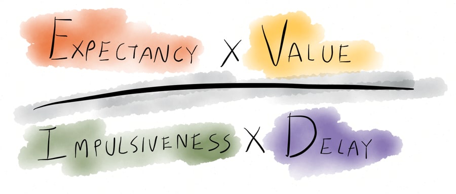 Expectancy × Value is simply the expected value of the task. Impulsiveness is an innate/exogenous quality of the person whose motivation is in question, and Delay indicates now far that value is in the future. The result is our overall motivation to do the task.