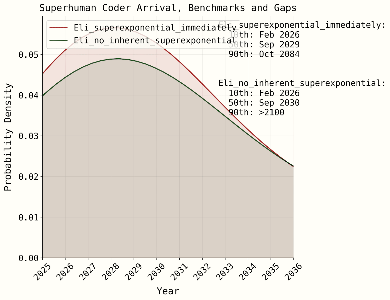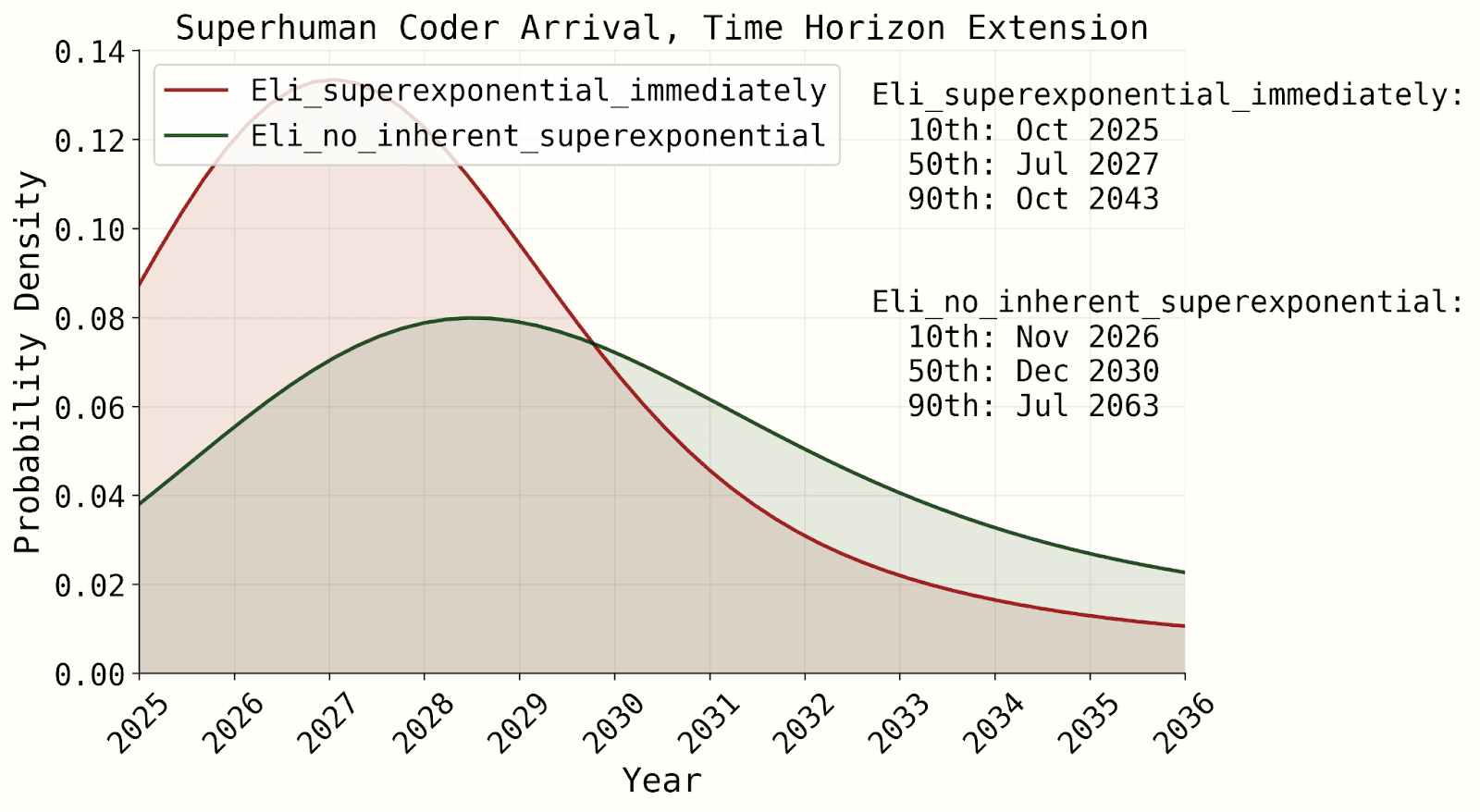 - My understanding is that AI 2027's forecast is heavily driven by putting substantial weight on such a superexponential fit, in which case my claim may call into question the reliability of this forecast. However, I have not dug into AI 2027's forecast, and am happy to be corrected on this point. My primary concern is with the specific claim I am making rather than how it relates to any particular aggregated forecast.